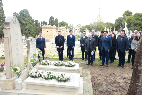 2026年4月2日,驻马耳他大使张佐带领使馆全体馆员及在马中资机构代表来到马耳他阿多洛拉塔公墓,举行一年一度的祭扫烈士墓仪式,悼念上世纪70年代在参与中国援马干船坞工程建设中献身的徐会仲烈士和谷岩昭同志。